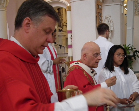 Nuotr.: Komuniją dalina (iš dešinės) kardinolas Francis George, OMI ir svečias iš Romos Marijonų ordino gen. vikaras kun. Joseph Roesch, MIC