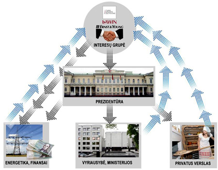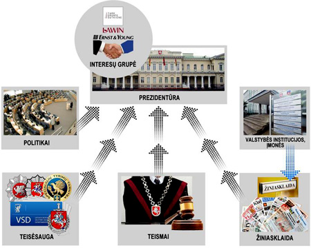 3. Teisėsauga saugo interesų grupę nuo nekontroliuojamų teisėsaugos pareigūnų, nuo kriminalinės žvalgybos tyrimų, nuo ikiteisminių tyrimų. Kalbama, kad Valstybės saugumo departamento generaliniam direktoriui buvo nurodyta nekišti nosies į energetikos ir finansų sektorių. STT šiose srityse taip pat tyrimų neatlieka, nes motyvuoja tuo, kad čia yra ne valstybės biudžeto pinigai. VSD, STT, FNTT, Policijos, Prokuratūros vadovai yra priklausomi nuo Prezidentūros. Jų likimas yra sprendžiamas Prezidentūroje. Šiandien esi turtingas ir sąlygiškai gerbiamas vadovas, rytoj – žmogus be darbo, su didelėmis problemomis ir gatvėje. Yra dėl ko stengtis.