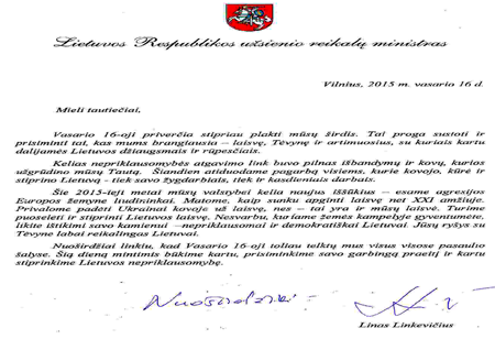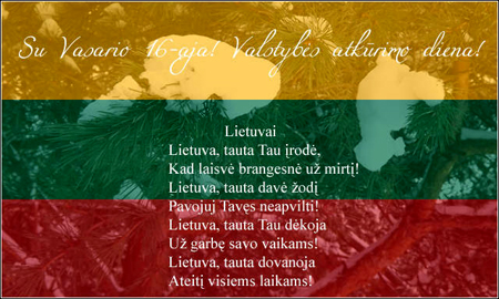 Valstybės atkūrimo diena – laisvos Lietuvos ir visų jos piliečių šventė. Didžiuokimės ir tikėkime Lietuva. Branginkime savo laisvę ir būkime jos verti. Tegul Lietuvos balsas sklinda per visą pasaulį.