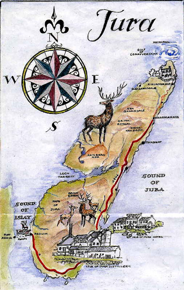 Sala JURA, sala ISLAY ir sąsiauris SOUND OF JURA yra Argyll and Bute Council dalis. Sound of Jura sąsiaurio šiaurinėje dalyje yra rifų, mažesnių salelių, stiprių vandens srovių ir sūkurių. Pati sala JURA yra gyvenama – dauguma jos gyventojų gyvena rytinėje salos dalyje. Iš viso gyvena tik du šimtai gyventojų, tačiau saloje taip pat ganosi ir penki tūkstančiai laukinių elnių. Vietos gyventojai tiki, kad salos pavadinimas kilęs iš „Island of the Deer“ – šioje vietoje mes galėtume su jais padiskutuoti. Daiktiniai istorijos šaltiniai siekia Geležies amžių – tai senovinės kapavietės ir stovintys akmenys, kurių aš nemačiau, tačiau manau kad juos galima priskirti istorijos paminklų kategorijai, nes juos siūloma aplankyti vietos turistams, kaip vieną iš vietinių įžymybių.
