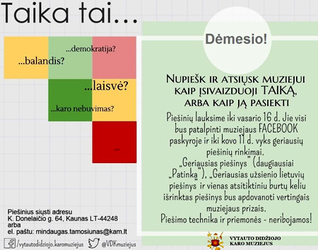 Nupiešk kaip TU įsivaizduoji TAIKĄ, arba kaip ją pasiekti, ir iki 2016 m. vasario 16 d. atsiųsk Vytauto Didžiojo karo muziejui (el. paštu mindaugas.tamosiunas@kam.lt arba paštu K. Donelaičio g. 64, Kaunas, LT-44248, Lietuva).