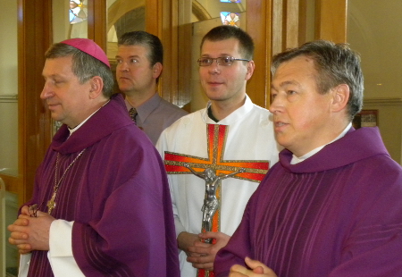 Nuotr.: I’te, mi’ssa est – Šv. Mišioms pasibaigus parapijiečius išlydi Vysk. R.Norvilas ir kun. J.Kelpšas (dešinėje)