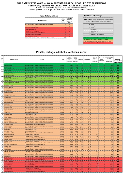 LR Seimo narių ir Seimo frakcijų reitingai sudaryti remiantis LR Seimo narių 2008 m. gruodžio – 2011 gruodžio mėn. veikla svarstant alkoholio kontrolės klausimus. Toks reitingas suteikia galimybę šioms problemoms neabejingiems Lietuvos piliečiams greitai ir objektyviai įvertinti kiekvieno praeitos kadencijos Seimo narį ir jo elgesį balsuojant, kuris dažniausiai labai skiriasi nuo rinkiminių kalbų ar daug žadančių programų.