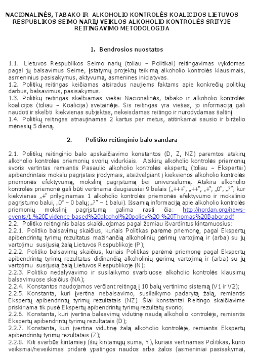1. Nacionalinės, tabako ir alkoholio kontrolės koalicijos Lietuvos Respublikos Seimo narių veiklos alkoholio kontrolės srityje Reitingavimo metodologija.