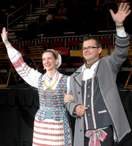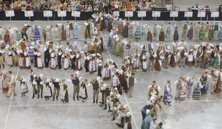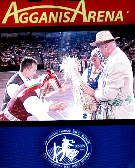 Į „Agganis“ arenoje susirinkusius kreipėsi ir LR ambasadoriai JAV bei Kanadoje – Žygimantas Pavilionis ir Gintė Damušytė, „Klevo lapo“ šalies Lietuvių Bendruomenės pirmininkė J. Kuraitė-Lasienė (nuotr. pirma iš dešinės). Pristačius šių metų šventės meno vadovus Vidą Brazaitytę ir Romą Jonušonį, prasidėjo dviejų dalių (25 šokių) programa, kuri nepaliko abejingais nė vieno iš daugiau kaip 6 tūkstančių žiūrovų. Vilniaus Universiteto liaudies dainų ir šokių ansamblio atstovų liaudies muzikos instrumentų ir skambių balsų fone „Agganis“ arena vienai dienai virto tikra Lietuvos kultūros tvirtove.