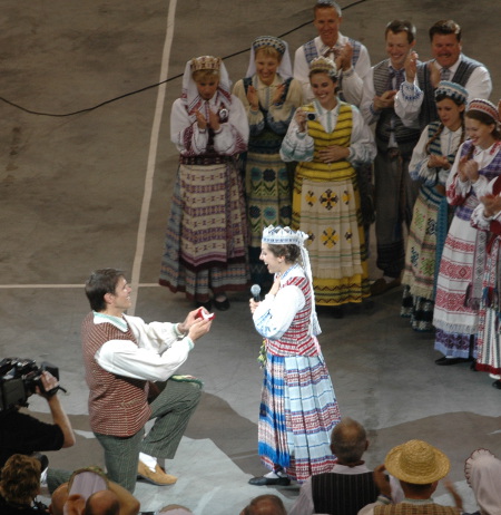 Neapsieita ir be XIV-osios Šokių šventės „akibrokšto“ – po paskutinio šokio prieš didžiąją pertrauką, į arenos vidurį išbėgęs Čikagos „Grandies“ šokėjas Paulius Riškus sukvietė kitus grupės narius ir… parpuolęs ant kelių pasipiršo savo sužadėtinei Alexandrai Habanek. Ar galėjo būti dar ypatingesnė akimirka? Tūkstančių šventės dalyvių nuomone, tikrai ne… o po dar vieno pusšimčio metų linkime Pauliaus ir Alexandros mažiesiems tęsti Šiaurės Amerikos lietuvių tautinių švenčių organizavimą.