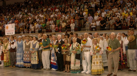 Iki pat sekmadienio vidurdienio, nuo praeitos savaitės pradžios, iš visų Amerikos kampelių link Bostono traukę mūsiškiai ruošėsi didingam renginiui, bet, matyt, nedaugelis tikėjosi, kad į vieną garsiausią Naujojoje Anglijoje „Boston University“ tūkstančius talpinančią „Agganis“ areną susirinkusius tautiečius apims neapasakomas jausmas, XIV-osios šokių šventės pranešėjams Gretai Šmidt ir Kęstučiui Daugirdui pristatant skirtingų šalių, miestų ir kartų šokėjų grupes. Ypač sujaudino 75-metį šiemet švenčiančios seniausios Amerikos lietuvių tautinių šokių grupės „Sambūris“ (nuotr. žemiau) pristatymas, kai į areną įžengė garbingo amžiaus tautiečiai, šioje grupėje šokę 1937 m. Šiltai sutikti ir O. Pivoriūnaitės- Ivaškienės sūnus Rymantas Ivaška su anūku Aleksu.