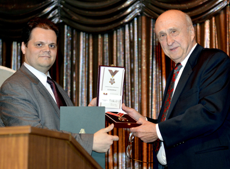 Nuotraukoje LR generalinis konsulas Čikagoje M. Gudynas teikia apdovanojimą A. Rudžiui (fot. J. Kuprys)