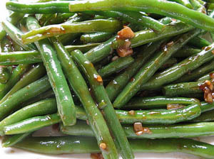 Lydytame naminiame svieste pakepinkite (galima pakepinti alyvų arba vynuogių kauliukų aliejuje, pagardinus šlakeliu sezamo aliejaus, bet subtiliau, netgi lietuviškiau bus lydytame naminiame svieste, kuris suteikia nepakartojamą riešutų skonį. Iš tikro naminio sviesto kilogramo gausite 800g lydyto, kuris net pusę metų atvirai kambario temperatūroje laikomas negenda) žaliąsias arba kitos spalvos ankštines pupeles 5 minutes, po to įberkite smulkiai sukapotų svogūnų ir česnakų, uždenkite dangtį ir dar 3 minutes kepkite. Patiekiant, užbarstykite 20-15g tarkuoto parmidžano, galima ir tarkuoto Džiugo sūrio, bet, kai jį pirksite, pasirinkite, kad sūris būtų kuo kietesnis bei 5g kapotų bazilikų (galima mėtų arba petražolių, arba raudonėlių, – ką rasite turguje ar savo darže).