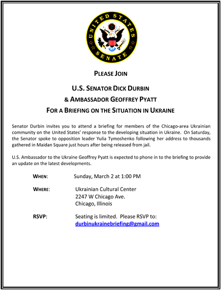 Senator Durbin invites you to attend a briefing for members of the Chicago-area Ukrainian community on the United States’ response to the developing situation in Ukraine. On Saturday, the Senator spoke to opposition leader Yulia Tymoshenko following her address to thousands gathered in Maidan Square just hours after being released from jail.
