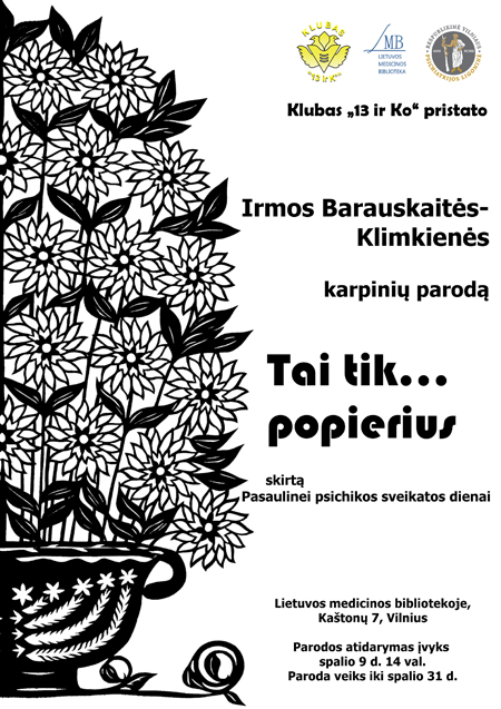 Kaip ir kasmet, šį spalį klubas „13 ir Ko“ kviečia apie psichikos sveikatą pakalbėti ir meno kalba. Šį kartą klubas pristato savo ilgametės bendradarbės, meno terapeutės ir vienos iš meno terapijos pradininkių Lietuvoje Irmos Barauskaitės-Klimkienės karpinių parodą „Tai – tik… popierius“.