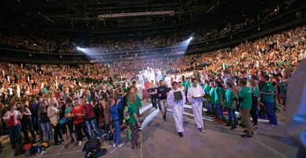 Ant kelių prieš apšviestą Švč. Sakramentą suklupo visa „Žalgirio“ arena. „Tai buvo puikus įrodymas, kad mes tikime, garbiname ir lenkiamės Dievui“, – prisiminė LJD dalyvis.