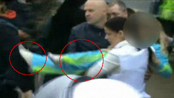 Nuotr.:Sukant sukryžiuotas kojas, sukeliamas kritimo įspūdis – Mergaitė automatiškai griebia nešantiems už pečių, klykdama iš skausmo ir išgąsčio. Advokatas G. Černiauskas laiko mergaitę už kairės kojos šlaunies. Advokatas G. Černiauskas plėšia į save kairę mergaitės koją, o L. Stankūnaitė – dešinę mergaitės koją. Tai specialus labai skausmingas kovinis būdas priversti nesipriešinti. TEISMO SPRENDIMAS: PRIEVARTA PRIEŠ MERGAITĘ NEGALIMA. PRIEVARTA BUVO. NETRUKDYMAS VYKDYTI NUSIKALTIMĄ YRA BENDRININKAVIMAS NUSIKALTIME.