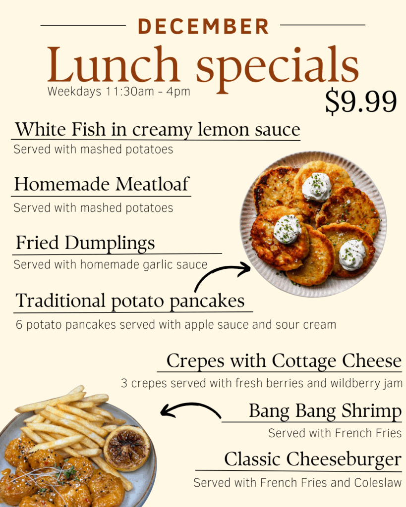 | December Lunch Specials Delicious, homemade, fast, and affordable! Ideal for your lunch break! ONLY $9.99! Available for dine-in and carry out. |